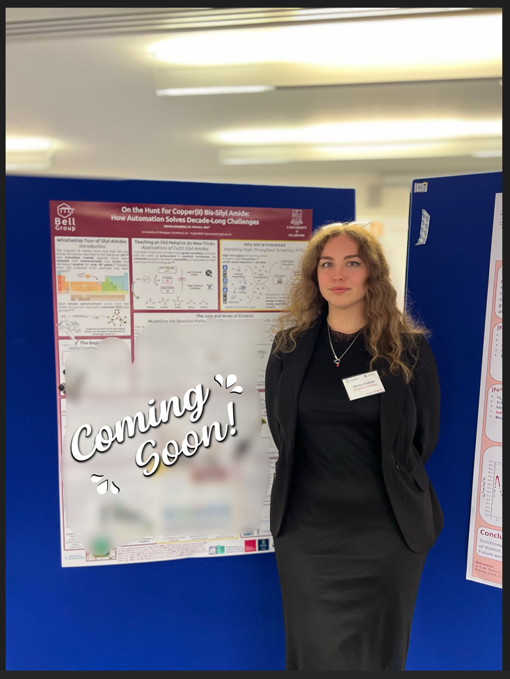With the new semester now in full swing the Bell group is growing. We’re delighted to welcome Marina as our first PhD student who will be investigating high throughput organometallic chemistry. Marina comes to us from the University of Strathclyde and enjoys learning German in her spare time.
